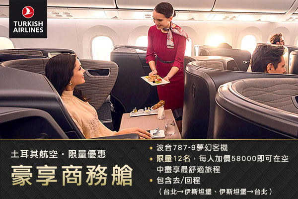 加價席次、限量12席:搭乘土耳其航空,台北/伊斯坦堡/台北,來回升等團體商務艙,特惠加價NT58,000元/人(含機場稅及燃油稅)。