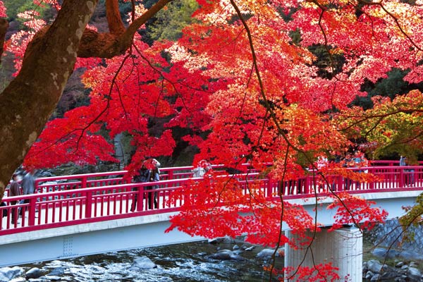 在日本東海地方最具代表性的紅葉名勝景點,位處於奧三河足助町的國家公園,在距離足助川和巴川交錯的巴橋上游約1公里的香嵐橋附近,每年11月中旬至下旬左右,有著遍山遍谷的紅葉美景。