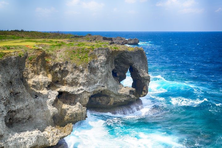 位於沖繩本島西海岸恩納村的國家自然公園。天然的草原在眼前展開,周圍群生的植物,已被指定為縣立的天然紀念物。此外,還有隆起如象頭般的珊瑚斷岩絕壁,波浪襲來,令人不禁贊嘆大自然的雄偉。