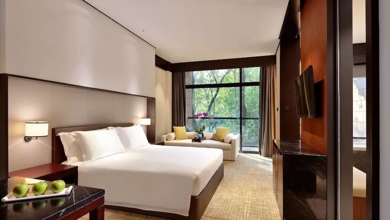 杭州千禧度假酒店坐落於西湖以南,錢塘江以北,在寧靜的九溪風景區內,被大片龍井茶園以及古樹叢林環抱。 在都市繁忙生活閒暇之餘,相信您一訂會陶醉於湖光山色與綠意盎然的美景之中,再加上酒店的優質服務,勢必給您帶來全新的旅居體驗。 151間寬敞明亮的客房,其中包含10間套房。 每間客房均有獨立的陽台,可近距離感受自然美景,隨時沐浴在山林小溪的清新微風中。