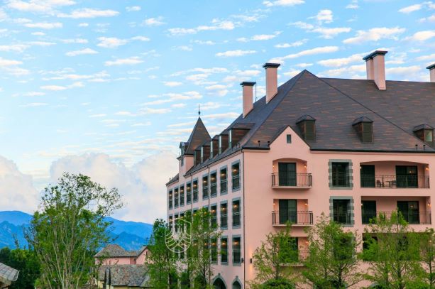 以獨特的粉紅色豎立在遍地都是柚子林鄉間,柚花季時在飯店內就能聞到淡淡花香,且每間房間均附有溫泉缸,溫泉泉質為「氯化物碳酸氫鹽泉」,因富含礦物質所以會略為黃濁色,有「黃金美人湯」美名,也稱「生男之泉」、「英雄湯」,泡湯同時搭配著窗外的田園景色及遼闊的大山雲海,這完全能讓平日辛勤所累積的疲憊一併消除。