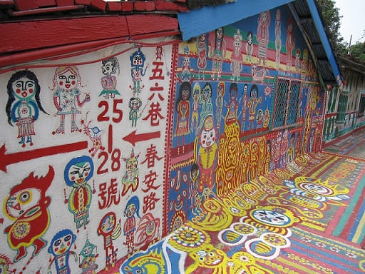 短短一段150公尺長的巷道,從屋簷、圍牆、路面到郵筒,素人畫家黃老先生畫出了五顏六色的線條與圖案,這些圖案充滿童趣與喜感,洋溢著年輕歡樂的氣氛,吸引許多人爭相前往參觀或是婚紗照取景。