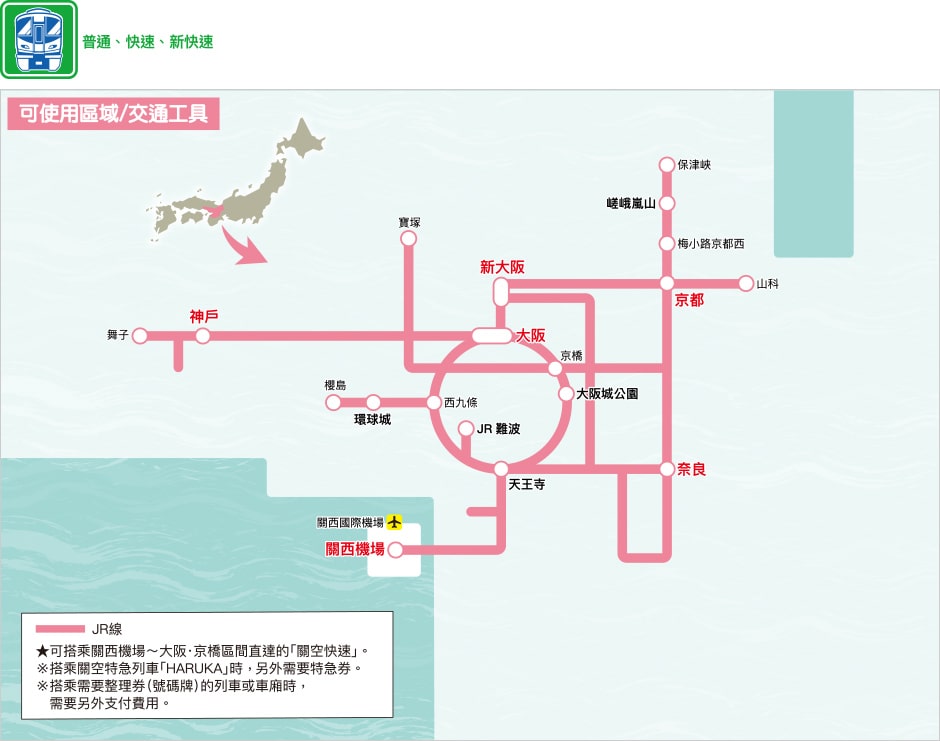 1.可於使用日起,連續3日無限次乘坐以下適用範圍JR線的普通車廂自由席:普通列車、快速列車、新快速列車