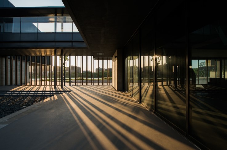 桃園市兒童美術館鄰近景觀優美的青塘園,以「遊樂化的展館、景觀化的建築」為設計理念,採用三角造型為主要結構,白色基底搭配大面積玻璃引入自然採光,將戶外景致融入館內空間,打造出別具特色的山丘美術館,為親子觀眾提供一處結合藝術與遊憩的空間。