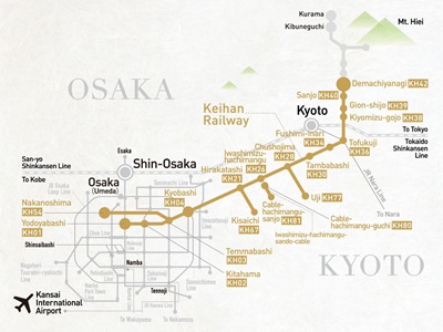 京阪電車是連結京都、大阪、滋賀的路線。沿線有大阪城、伏見稻荷大社、祇園、清水寺、下鴨神社等觀光地不勝枚舉。除了連結大阪和京都外,還有往平等院方向的宇治線,以及沿著琵琶湖行駛,連結京都和滋賀大津的大津線等多條路線。