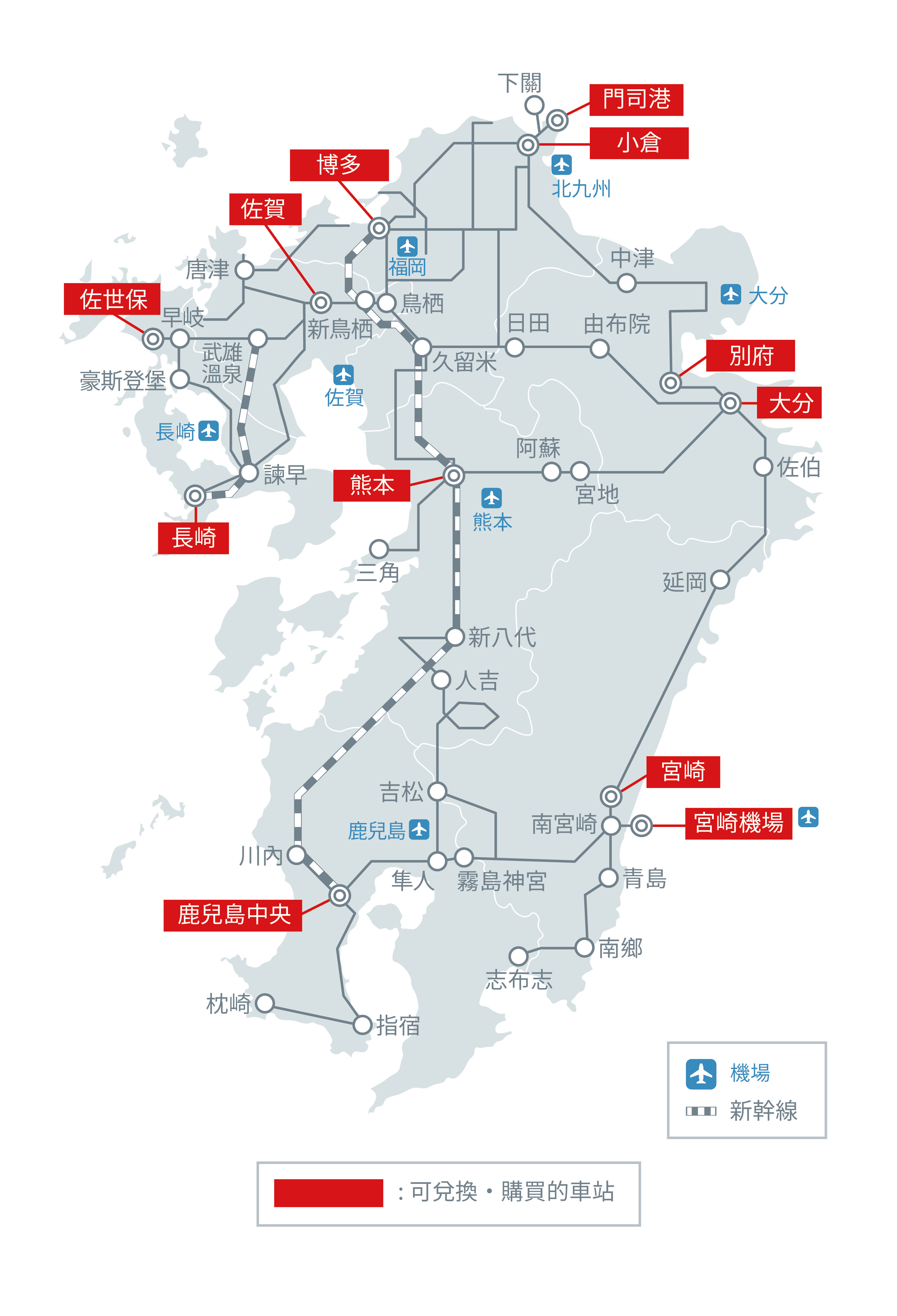 可透過周遊券前往九州:福岡、大分、熊本、長崎、佐賀、宮崎、鹿兒島地區旅行。