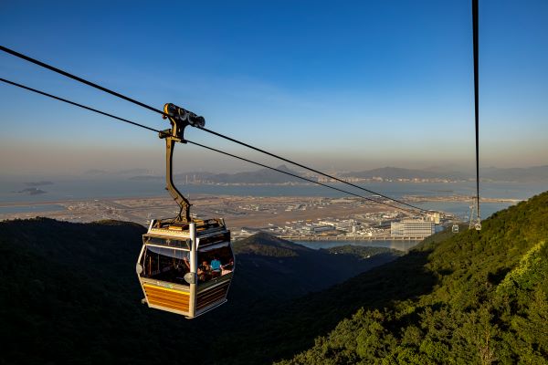 昂坪纜車連接大嶼山東涌市中心及昂坪,坐在舒適寧靜車廂內,放眼遠望全長接近50公里的港珠澳大橋,很輕易就會發現海天一色的絕美景致。
