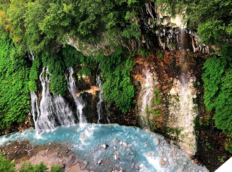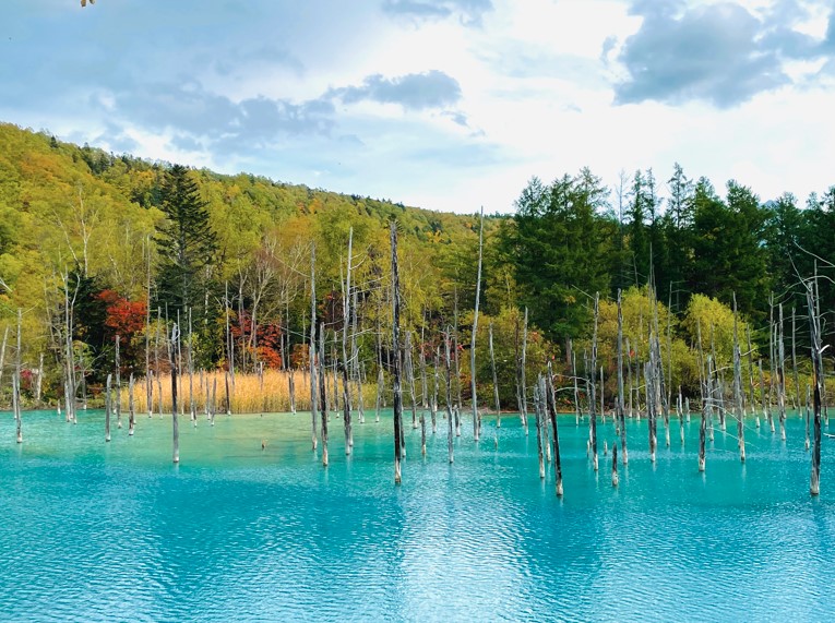 位於北海道美瑛川左岸,因攔截火山岩漿修建的水壩截流而成,在陽光下,池水會反映出藍色,故而得名。