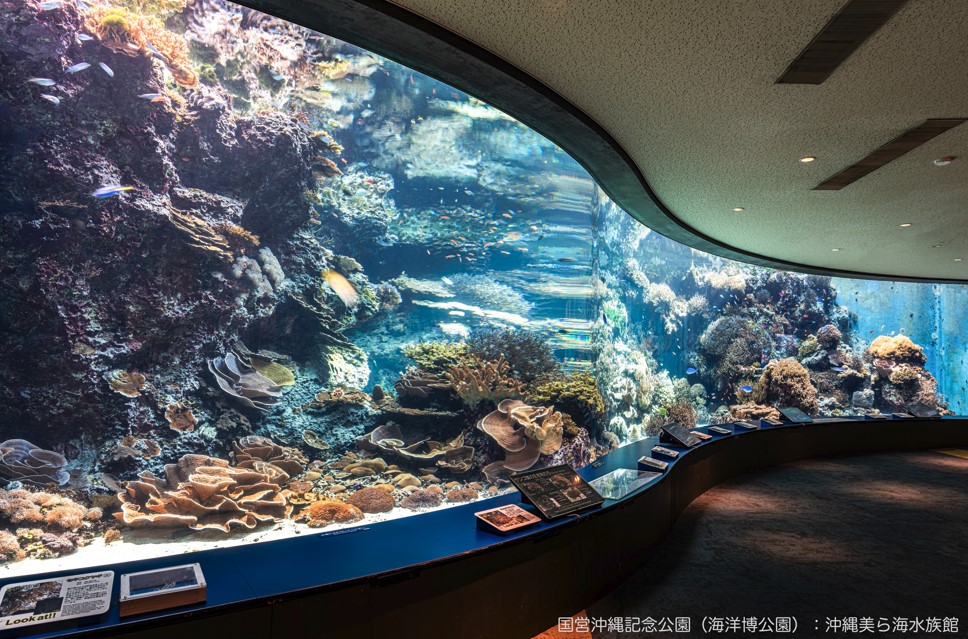 該館以沖繩的海洋為展示概念,展出珊瑚礁、黑潮之海、深海等各式海洋生物。