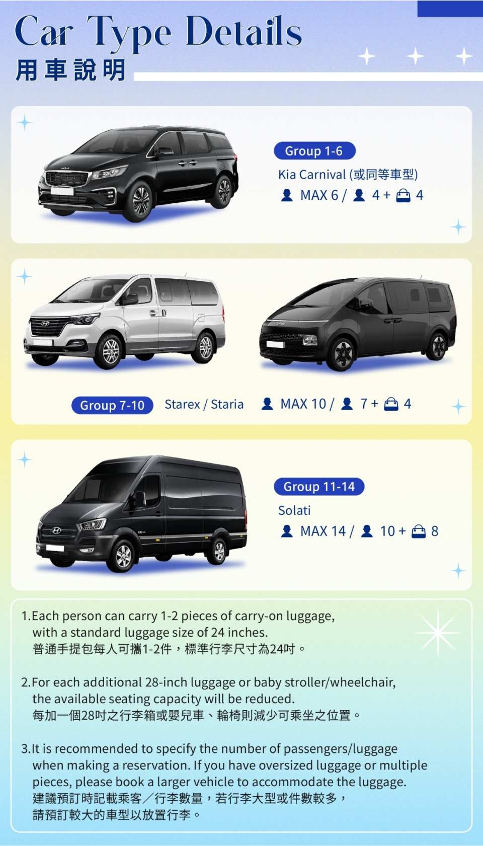 4.適用車型不包含行李箱/兒童座椅/嬰兒車等大型物件,如有攜帶大型物件視同一位人數,下單時請自行判斷適用車型,如當天用車時有無法乘載之情況,視同個人疏失,本公司將不承擔責任。