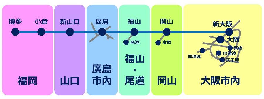山陽新幹線從新大阪站到博多站,全長約555公里,是從大阪到日本中國地區各縣的主要交通路線,包括岡山、廣島和山口。