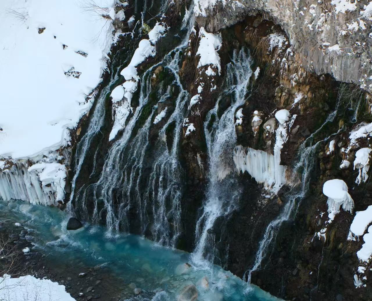 白須瀑布位於美瑛町的白金溫泉鄉,落差30公尺,海拔600公尺,從岩石的縫隙間傾瀉而下如白須般的水流而得名“白須瀑布”。從地下湧出的水流,拍打著岩石,激起泛著藍色光茫的浪花。
