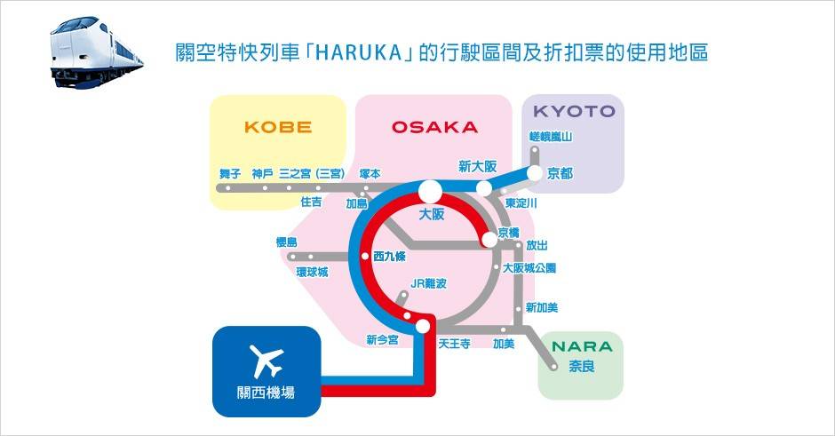 1.關空特快列車「HARUKA」,是從關西機場前往天王寺、大阪、新大阪、京都、神戶、奈良等關西主要市區的最佳手段。