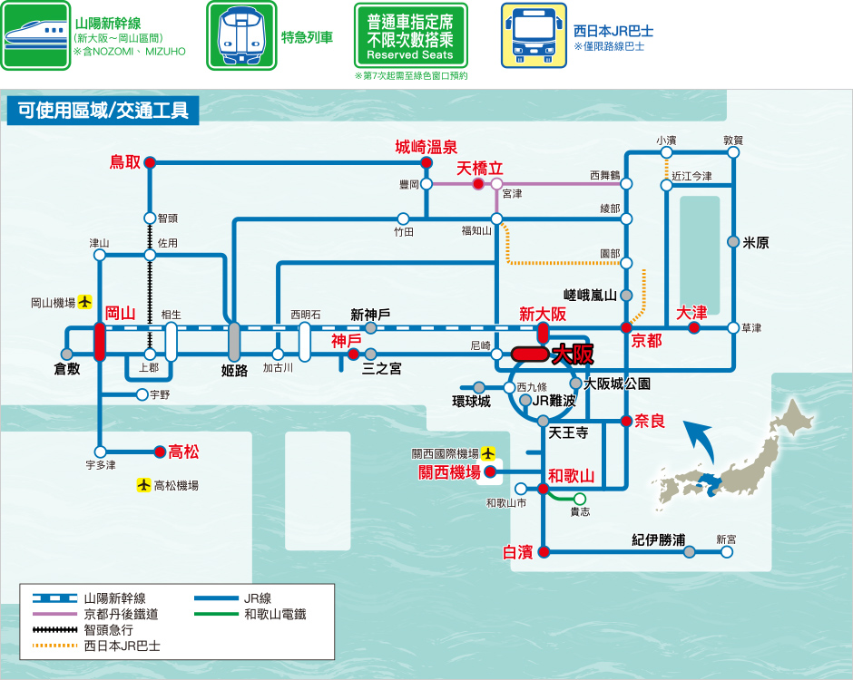 『關西地區鐵路周遊券』可選擇一日、二日、三日、四日或廣域五日票,搭乘JR遊覽關西地區。