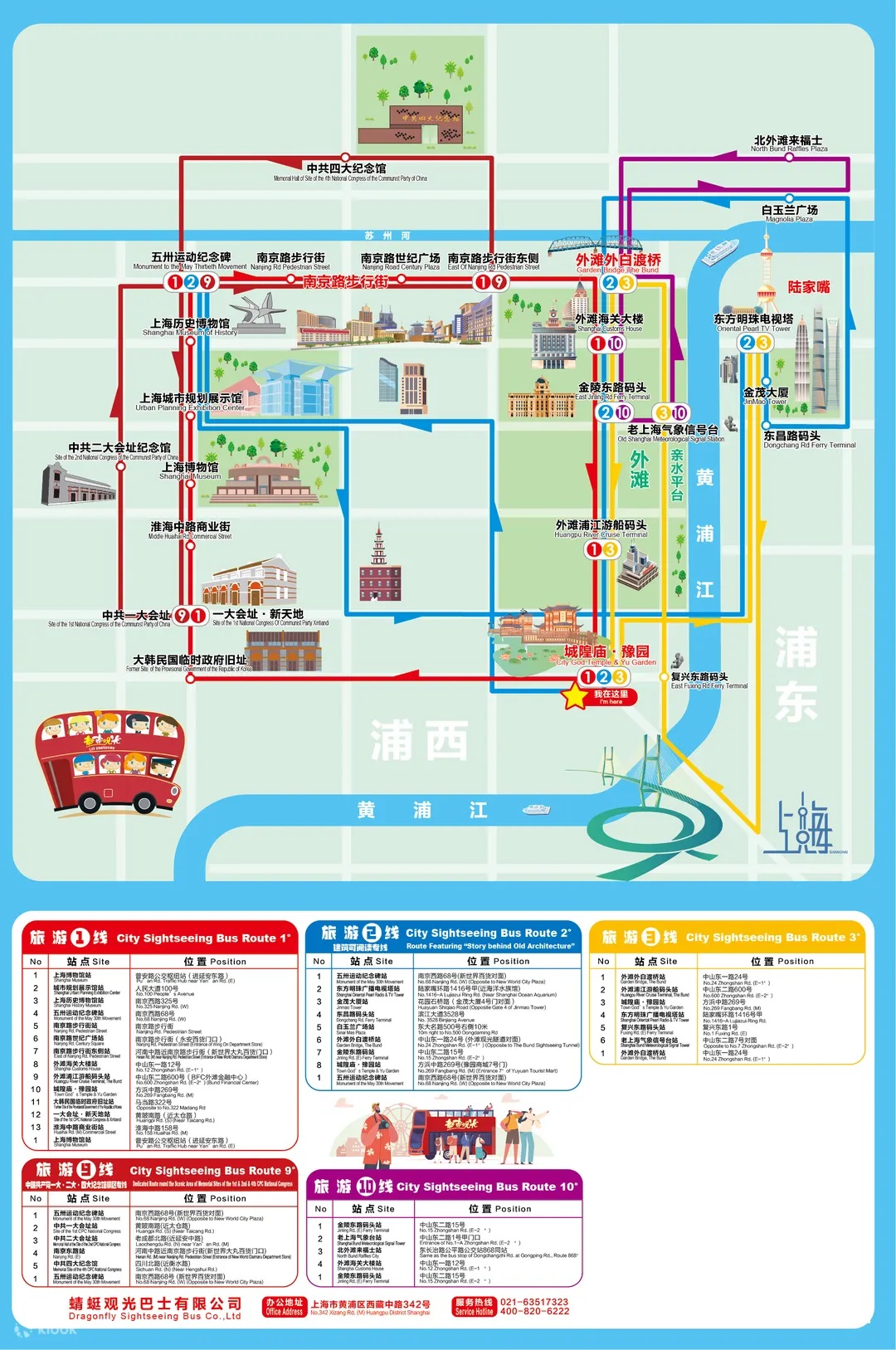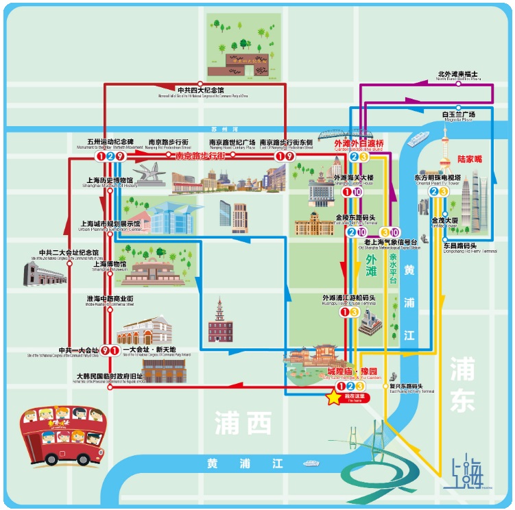 站點:五卅運動紀念碑➔東方明珠廣播電視塔➔金茂大廈➔東昌路碼頭➔白玉蘭廣場➔外灘外白渡橋➔金陵東路碼頭➔城隍廟·豫園➔五卅運動紀念碑。