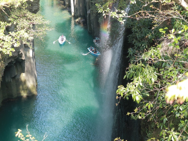 「高千穗峽」為日本著名的神話景點,能於此自行租借小船遊歷谷底風情。峽谷內更有被列入日本百選瀑布的「真名井瀑布」。