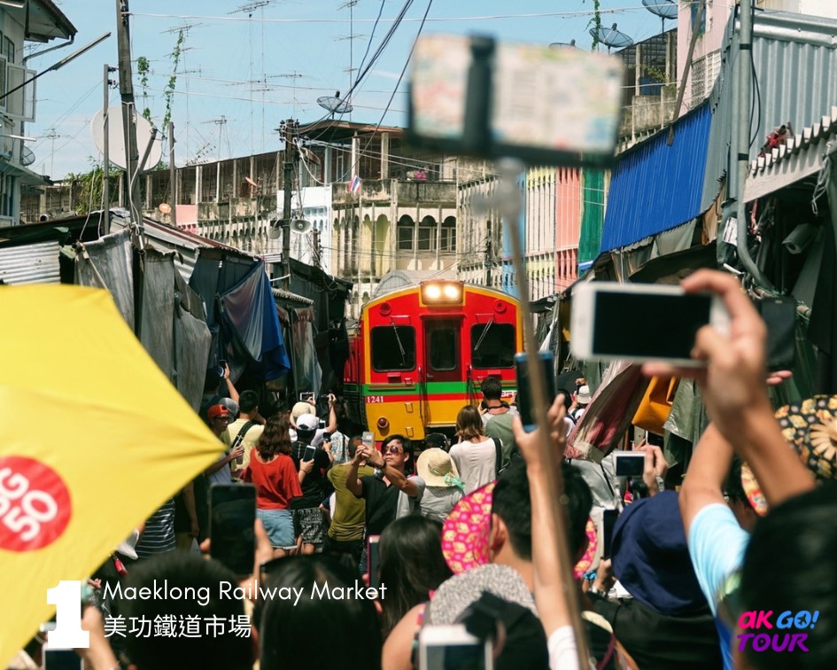 「火車上」視角+「擠在鐵道旁邊」兩種角度,感受大不同!曼谷自由行必拍照打卡經典!鐵道市場位於泰國的「MAKELONG STATION」車站旁,是泰國極少數建立在鐵軌上的傳統市場,觀看市集攤販是如何隨著火車的來去,將攤位收放自如的獨特生活型態!