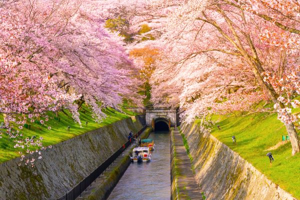 琵琶湖疏水為明治時代的重要水利工程,沿岸種植大量櫻花樹,每到春天形成長長的粉色花廊。旅客可沿著河道散步賞櫻,或搭乘遊船欣賞櫻花倒映水面的景色,結合歷史人文與自然風光,極具魅力。