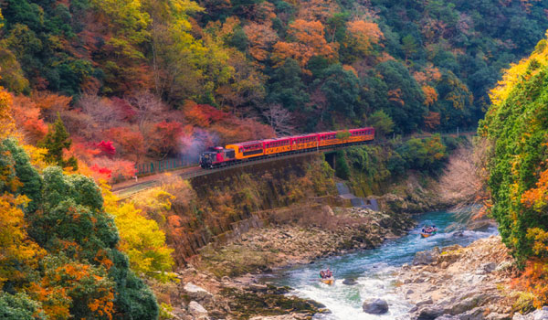 「羅曼蒂克鐵道」究竟有多浪漫?嵯峨野小火車,沿著桂川河谷保津峽順流而下,幽雅細緻的山川峽谷地形,風光秀麗,每逢紅葉季節,滿山豔麗的紅葉讓人目不轉睛,是不可錯過的最佳觀賞路線。
