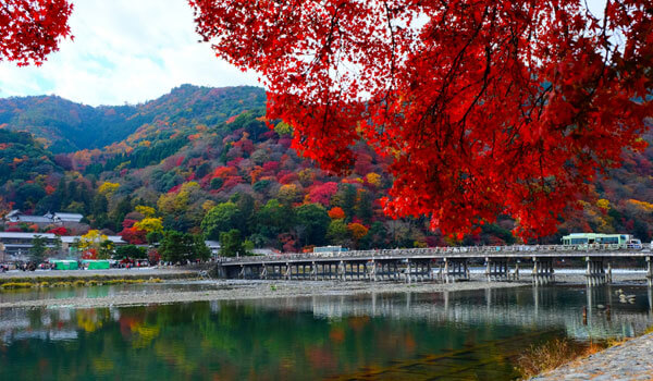 水光山色的嵐山是呈現京都四季美景的地方。秋天渡月橋兩岸的楓樹林借景嵐山、龜山與小倉山,搭配成一幅天然楓景圖,美景吸引遊客絡繹不絕,橋下的桂川波光粼粼,水鳥點綴其間,彷若人間仙境。