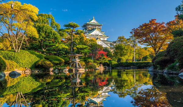 廣闊的大阪城公園除了賞春櫻,也能賞秋楓。護城河旁的紅葉林華麗的染紅城池周圍,水中倒影映著城廓和艷紅。走入城內,路旁金黃耀眼的銀杏一同點綴秋日色彩,主角天守閣在秋楓相襯之下更顯巍峨宏偉。