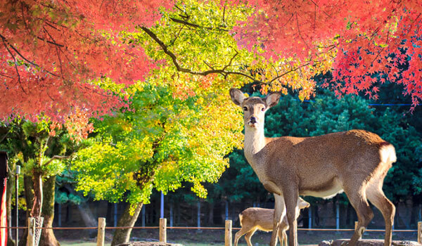 佔地廣大的奈良公園,包含多間寺廟與神社,吸引遊客在古色古香的建築群內悠閒漫步,秋季楓紅更為奈良公園添上一份秋意,當然講到奈良不能不提及,一年四季都在那等著餵食的鹿群們囉!