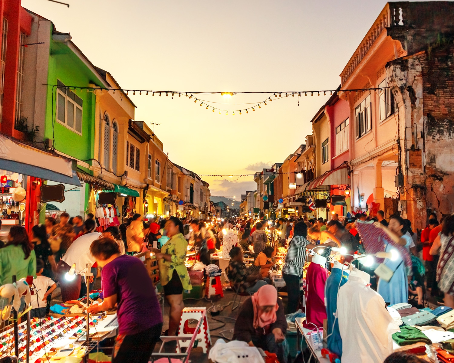 普吉鎮最熱鬧的市集,以白天街道兩旁色彩豐富的南洋老屋裡的特色小店最為看頭。