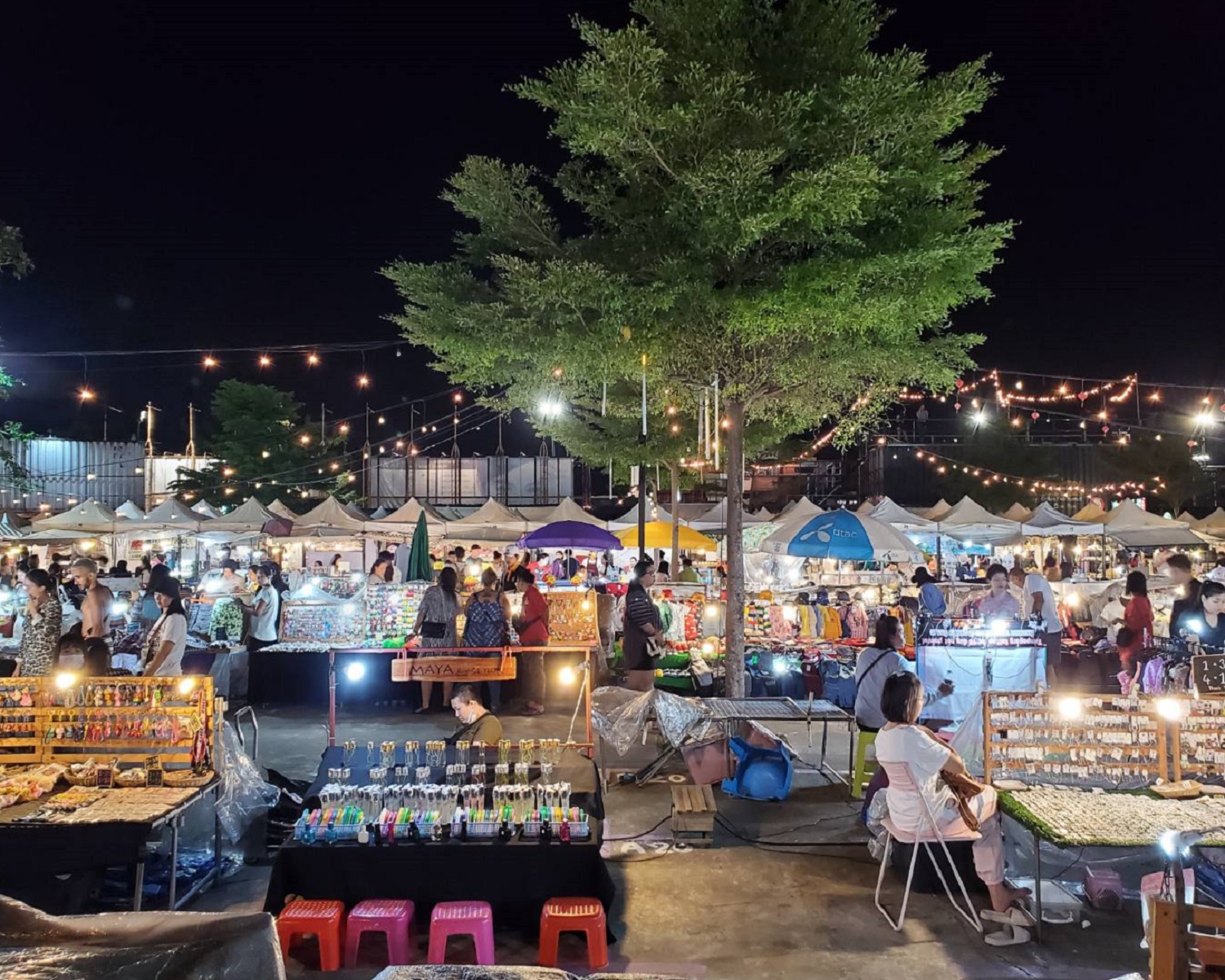 原拉差達火車夜市歇業後,另尋地點新創的夜市!由簡約中帶點文青感的白色帳篷搭建而成。