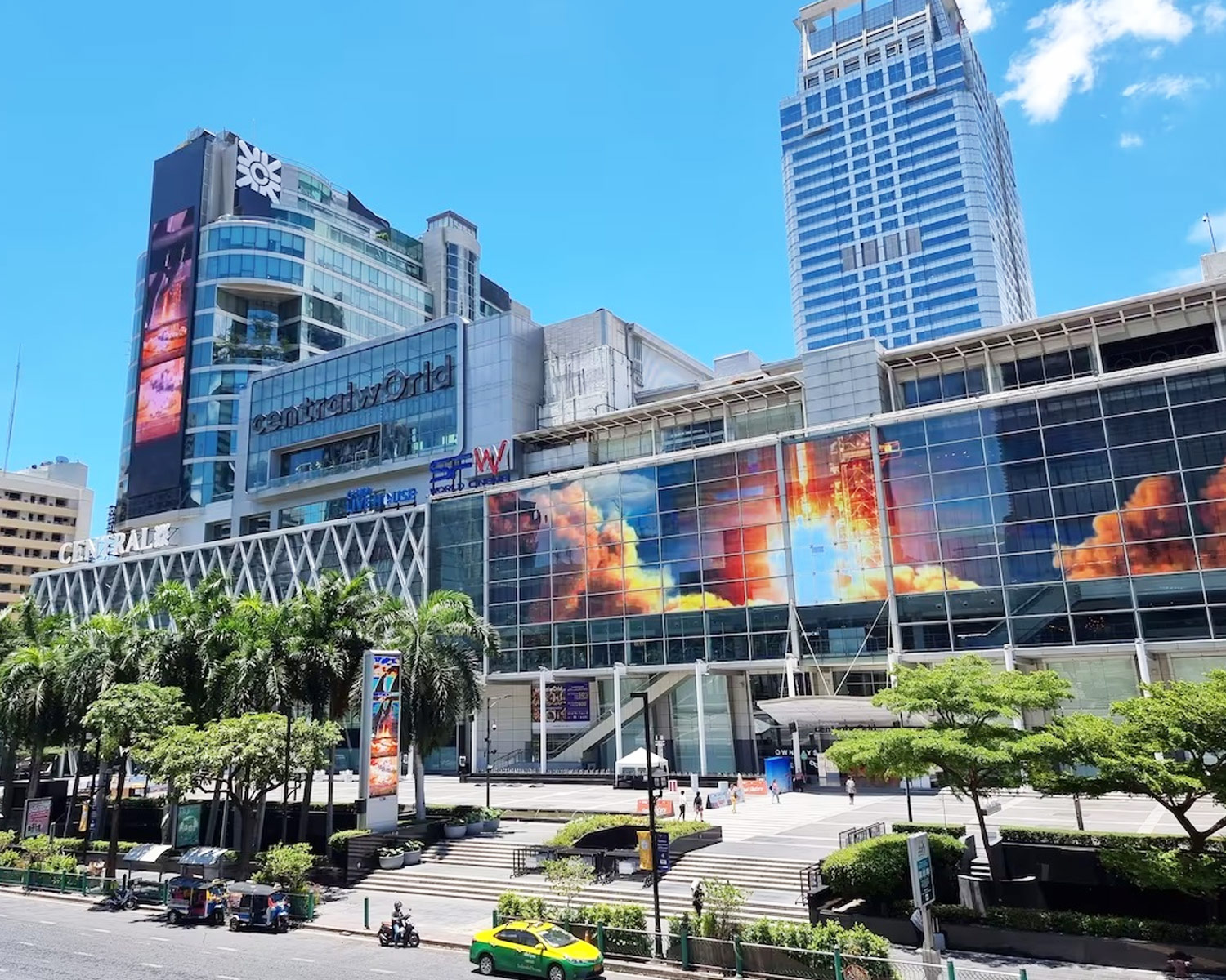 全曼谷最大的購物中心,各大國際品牌與泰國在地商品齊全,超市、電影院、餐廳美食也都有。Central World前的大廣場佔地8,000平方公尺,是舉辦各式各樣活動、表演、見面會的場地,每年跨年成為倒數狂歡的聖地,長方型巨大螢幕加上煙火及現場表演,是世界知名的跨年地點!