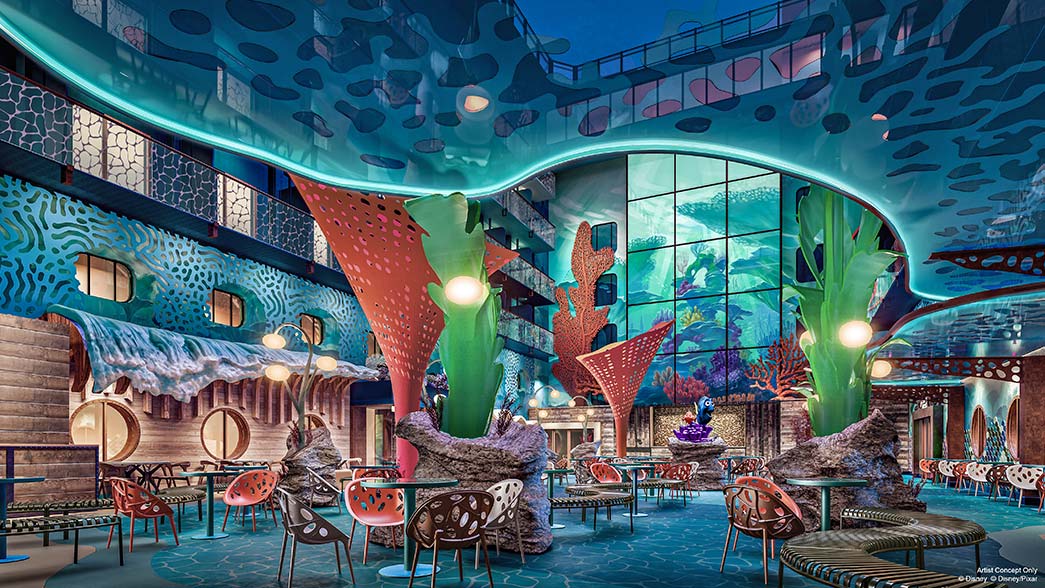 擁有家庭泳池、水滑梯和互動戲水區,日光甲板和觀景台提供充裕座位,全天播放迪士尼電影和問答遊戲,池畔有披薩、冰淇淋等速食,還有自助早餐和午餐可享用。